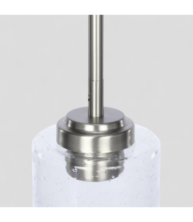 Good condition in box. Brushed nickel finish color. Seeded glass shade. Hardwired. Dry rated. Modern style. Mounting hardware included. Dimensions: 4.25"W x 4.25"D x 7.5"H. Adjustable hanging height: 15" to 46.5". Chain length: 36".