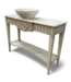 Pre-owned in good condition. Vanity With Marble Top And Vessel Sink. Decorative distressed grey base. Marble top and round marble vessel sink. 2 pre drilled faucet holes. 1 curved bottom shelf. Dimensions: 47.75"W x 15"D x 39.5"H with sink.