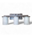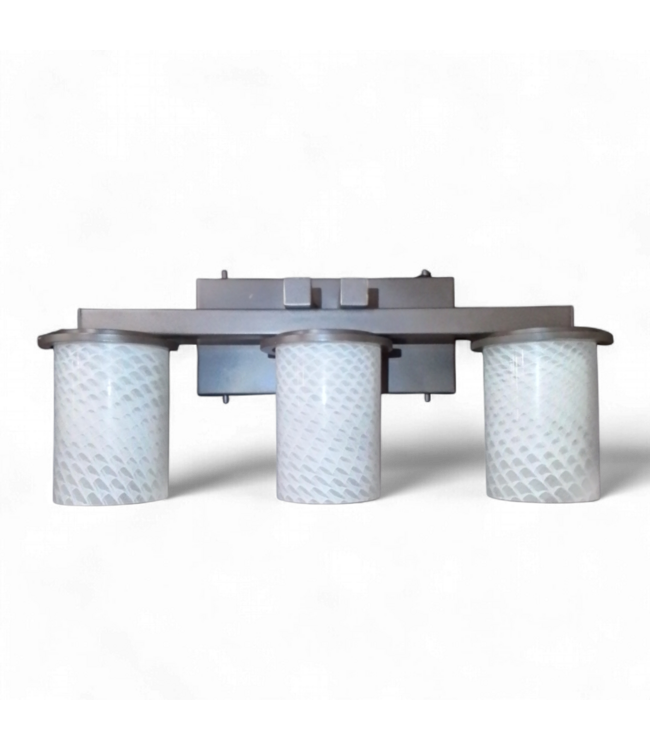 Good condition in box. Like new. Justice Designs Dark Bronze Three Light Bath Bar 21"W. Artisan glass shades. Hardwired. Damp rated. Uses (3) bulb type - G16 1/2 60 watt max (not included). Dimensions: 21"W x 9"H x 6.25"D.