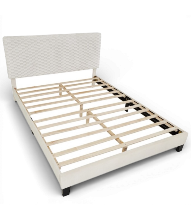 Good condition in box, ready to assemble. Roundhill Furniture Queen White Dove Upholstered Bed With Headboard. Findlay collection. MDF Wood. Assembled Dimensions: 65"W x 85"L x 45.5"H. Headboard: 3.25"D x 45.5"H. Footboard: 2.25"D x 10.5"H.