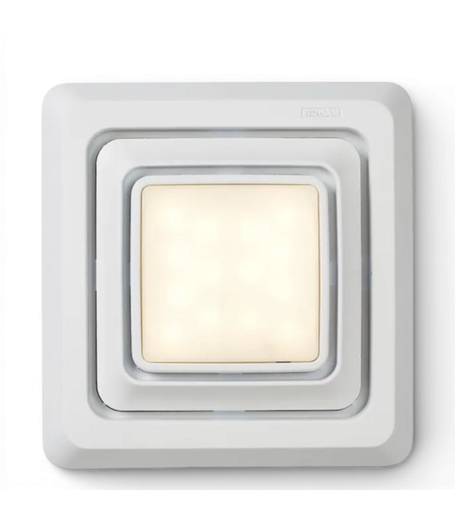 Good condition in box. Broan Nutone. Quick install. Soft white LED Light. 25,000 rated life. Includes two sets of grille springs for use with multiple ventilation fan housing. Dimensions: 9.75"W x 11"L x 2"H. Grille length: 9.75".