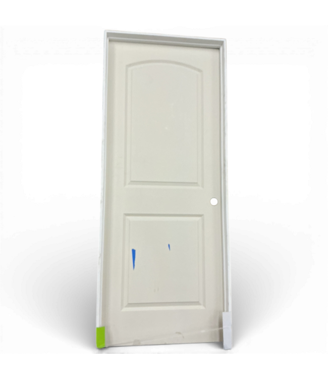 Good condition. Masonite. Primed ready to be painted. Left hand inswing. Hollow core. 2-Panels, top is arched. Dimensions: W/Frame: 33.5"W x 4.5625"T x 81.5"H. W/O Frame: 32"W x 1.375"T x 80"H. Does have small chips*see photo.