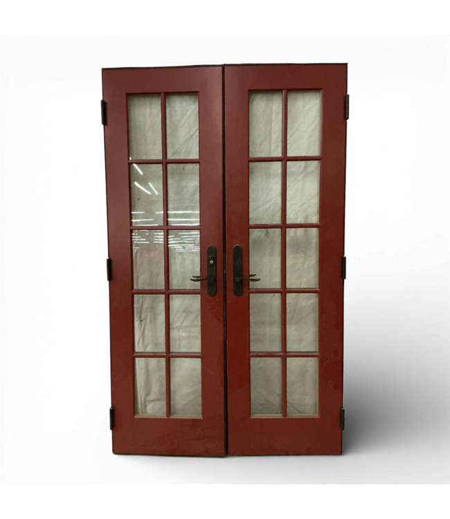 Used in good condition. Classic Prehung 10-Lite French Doors 48.5" x 79.5". Exterior: Features a barn red finish / Interior: Showcases a Natural wood finish. Dimensions: 48.5-in W x 79.5-in H. "priced for damage on frame / see photos"