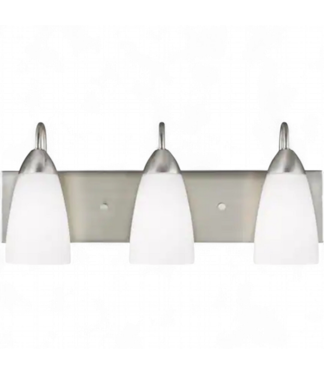 Good condition in box. Like new. Generation Lighting Seville 21-in 3 Light Brushed Nickel Transitional Bathroom Vanity light. Hardwired. Dimmable. Damp rated. Uses 4 A19 Medium 75 watt light bulbs (not included. Dimensions: 21"W x 4.75"H x 6.625"D. Read more.