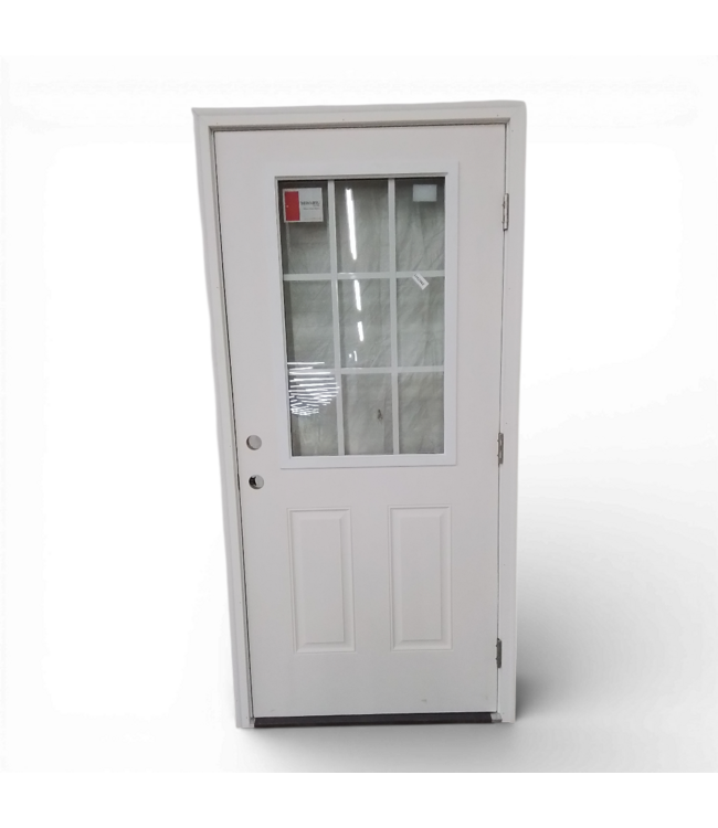 Good condition. Like new. Sold for $960 elsewhere. Therma Tru Prehung 1/2 Lite Exterior Door 37.5"W x 80.75"H with brickmould. Left-hand outswing. 9 grid -2A Low E insulation glass. Aluminum threshold. Dimensions: R/O: 37.5-in W x 80.75-in H.