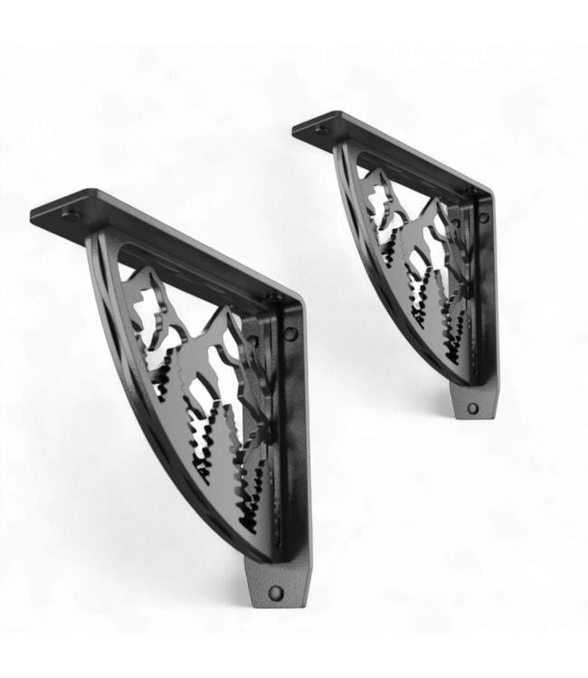 Good condition in box. Decorative, Heavy-Duty Metal Shelf Brackets. Matte black powder-coated finish. Each bracket contains a detailed laser-cut silhouette of a mountain range in the background with a dense evergreen forest (pine trees) in the foreground.