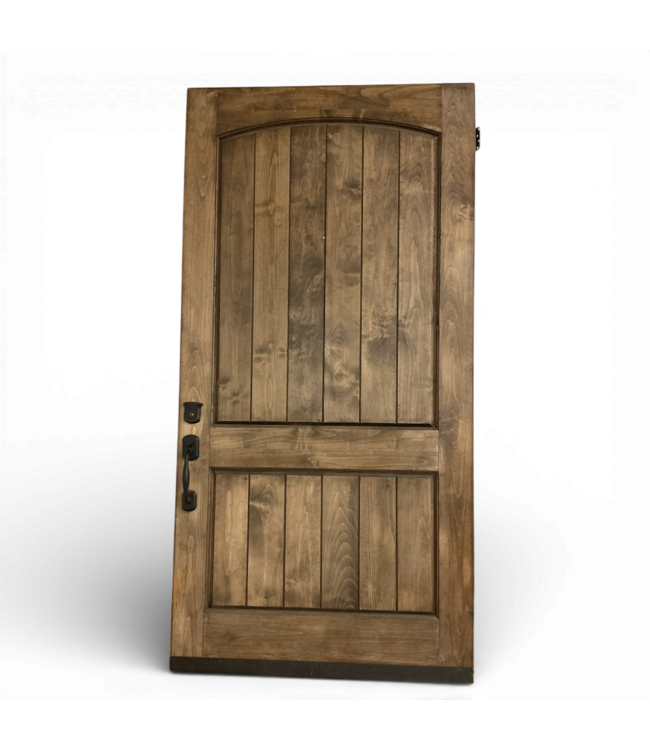 Used in good condition. Alder 2 Panel Exterior Door. Right hand inswing. Arch top design with vertical V groove panels. Oil rubbed bronze thumb latch handle. Weatherstripping. Frame not included. Dimensions: 47.75"W x 2.25"T x 95.5"H.