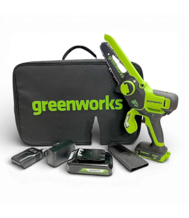 Good condition in box. Greenworks 24 Volt Chainsaw With Battery And Charger. 2 ah. Push start. Rear handle. Bar/chain oil included. Case included. Cordless. 7 speed. 32 drive links. Scabbard included. Dimensions: 6"L bar. .038" chain pitch.
