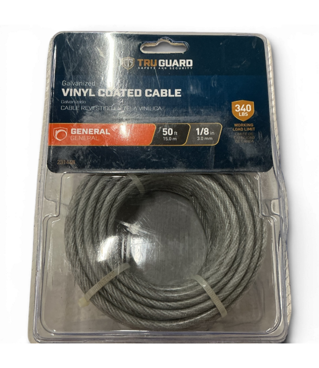 Good condition in package. 50 ft in length. 0.125" thick. 340 lbs. working load limit. Perfect for animal runners, leash and teather lines. Easy to handle and install. For professional or domestic use.