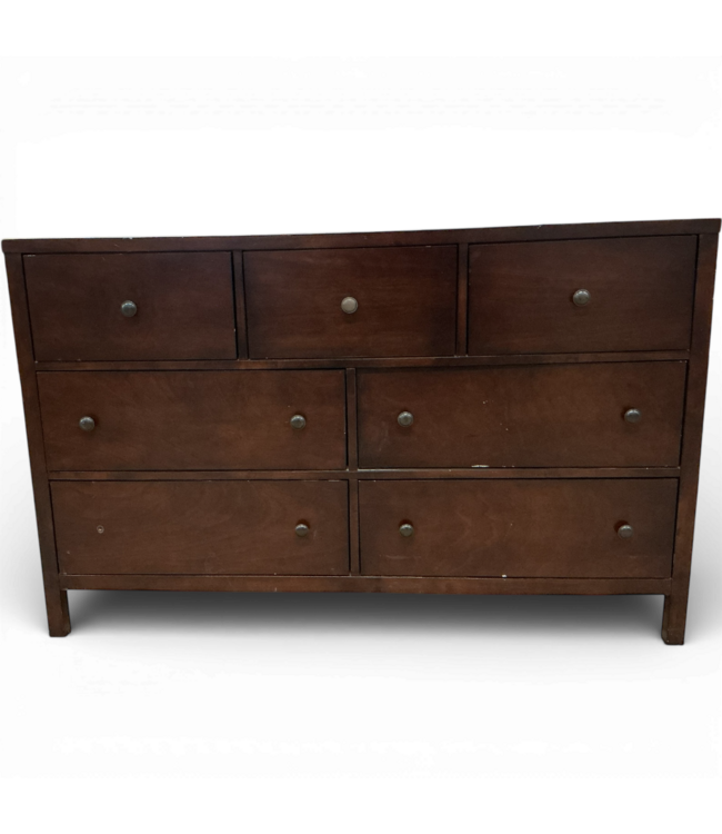 Used in acceptable condition. Mahogany color. Oil-rubbed bronze hardware included, one bottom drawer has 1 knob missing. Freestanding. 7-deep drawers. Dimensions: 59.5"W x 17.5"D x 38"H.
