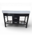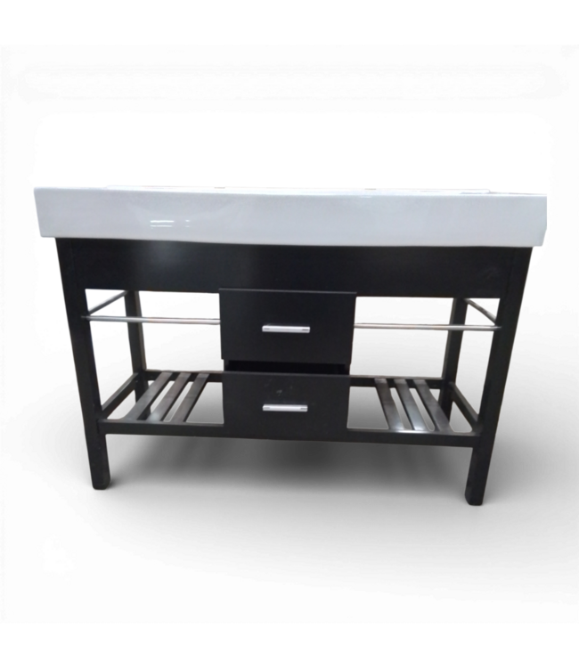 Good condition. Like new. Contemporary Double-Basin Bathroom Vanity 48"W. Dark wooden frame is an open-shelf design. Pre-drilled for single-hole faucets. Two central drawers with modern brushed chrome handles. Dimensions: 47.75"W x 34"H x 19"D.