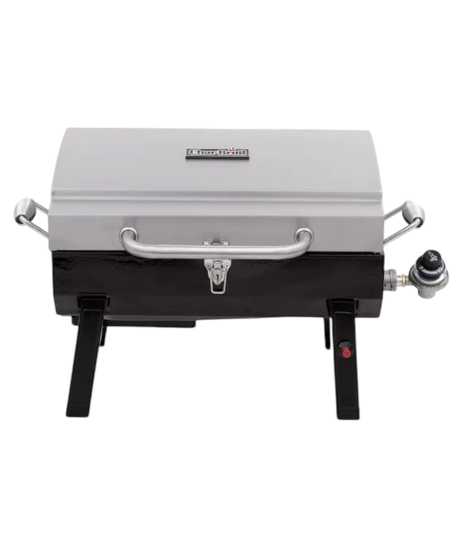 Good condition in box, ready to assemble. Char Broil Stainless Portable Liquid Propane Grill. Piezo ignition. Table top. Gas grill. 1 lb. cylinder. 15 burger capacity. Heat resist handles. Wire grate included. Dimensions: 24.8"W x 14.7"D x 14"H.