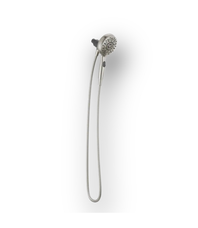 Good condition in box. Like new. Delta sure dock magnetic round shower head. 6-spray settings. Round shape. Installs in minutes. 72" metal hose. Soft rubber nozzles. Dimensions: 4.875"W x 10.125"L. 1.75 GPM. Satin nickel color.