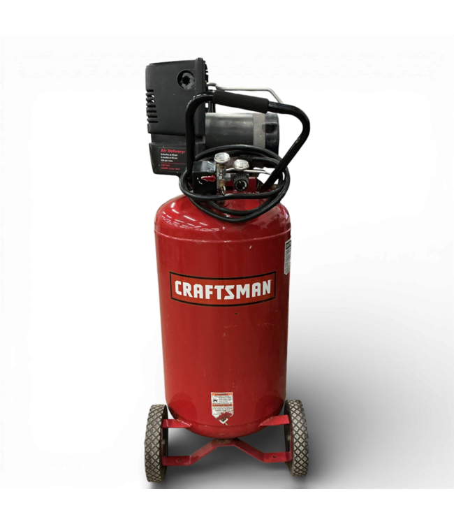 Good condition used. Corded Electric 30-Gallon Air Compressor 175 PSI. By Craftsman. Priced at $399+ elsewhere. Dual-voltage motor (120V or 240V capability). Features large wheels and vertical design for easy movement.