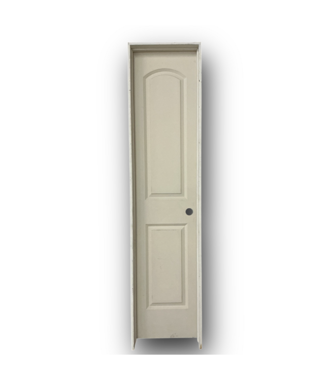 Good condition. Left hand inswing. Primed ready to be painted. 2-panels, arched top panel. Hollow core. Dimensions: W/O Frame: 17.75"W x 1.375"T x 80"H. W/Frame: 19.25"W x 4.625"T x 82"H.