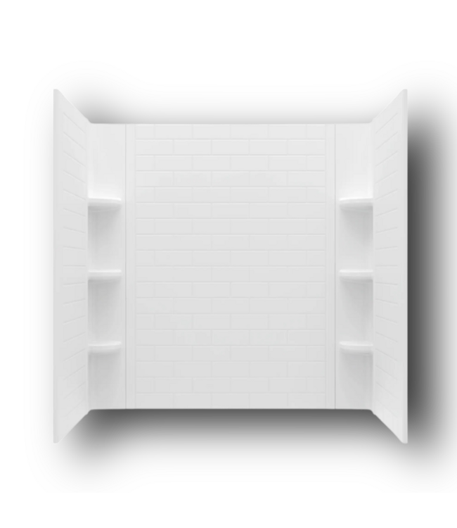 Good condition in box. American standard elevate collection. Subway tile design. Textured. Smooth surface. Easy to install. 6-Built-in shelves. Dimensions: 60"W x 31"D x 60"H. Common size: 60"W x 30"L x 60"H. Resist peeling & mildew.