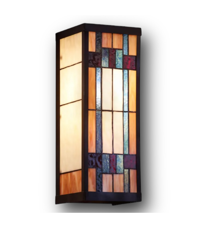 Good condition in box. River Of Goods Outdoor Lamps Hardwired Outdoor Wall Light. 1 light. Satin black. Craftsman style. Tiffany glass. Hardwired included. Wet rated. Weather resistant. Stained glass. Dimensions: 5.5"W x 6.25"D x 16.25"H.