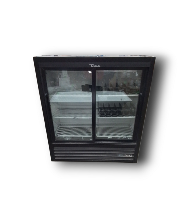 Used in good condition. Two Section Convenience Store Cooler 54-in H. Two sliding glass doors. Low-E thermal glass. Black vinyl exterior. Arrowhead branding. PVC coated wire shelves. Bottle organizer. Bottom mounted compressor. Front louvered grill.