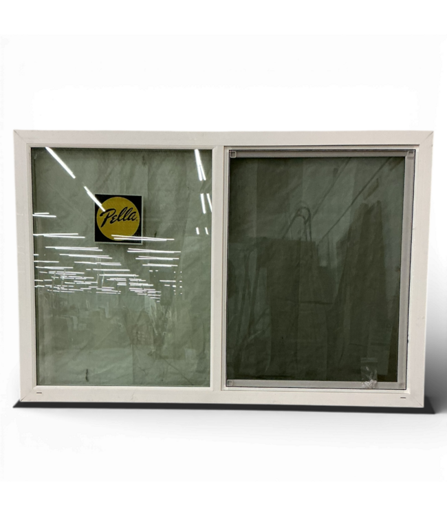 In good condition. Pella Sliding Window With Extra Lip Frame. 150 series. White vinyl frame. Sliding with screen. Annealed. OX Fixed/Vent. SunDefense Low-E. High altitude with argon gas. Dimensions: 71"W x 46"H.