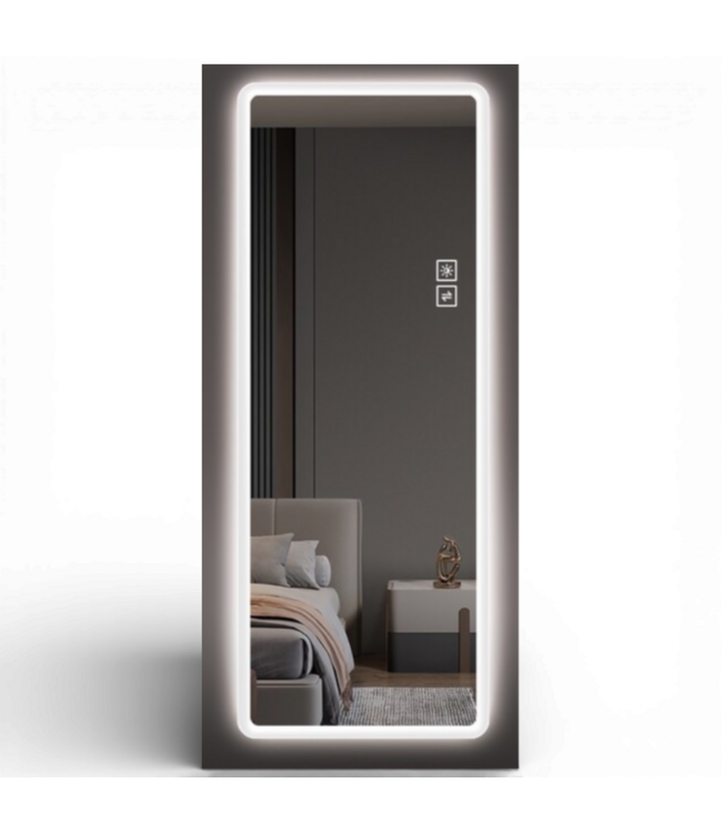 Good condition in box. Lovmor Full Length Lighted Vanity Body Mirror. LED. Wall mount. Rounded corners. Touchscreen 2 buttons adjust brightness and switch light color. Frameless. Vertical. Dimensions: 21"W x 0.98"T x 65"H.