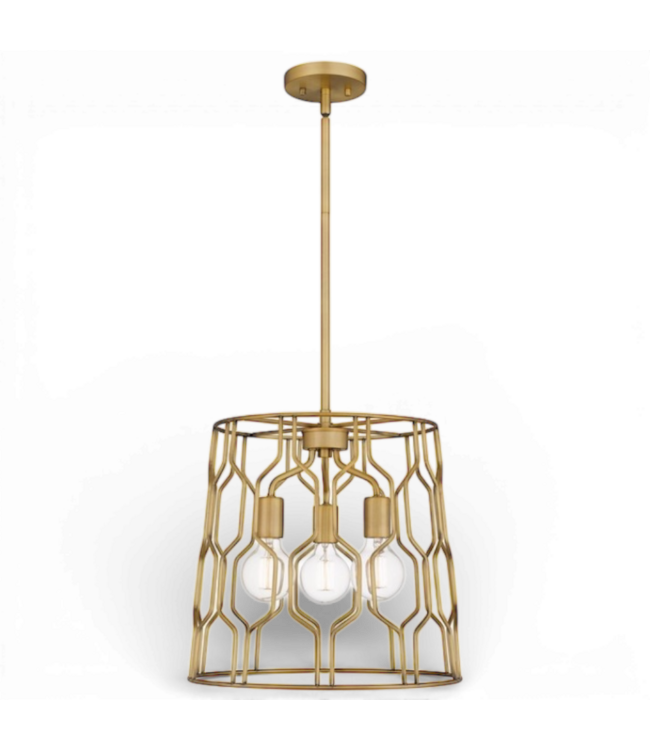 Good condition in box. 3-Light Aged Brass Hanging Pendant Light. elsewhere. Modern, cylinder open geometric framework. Durable steel, built to last, with polished look. Damp rated. Hardwired. Dimensions: (frame): 16"Diameter x 16"H.
