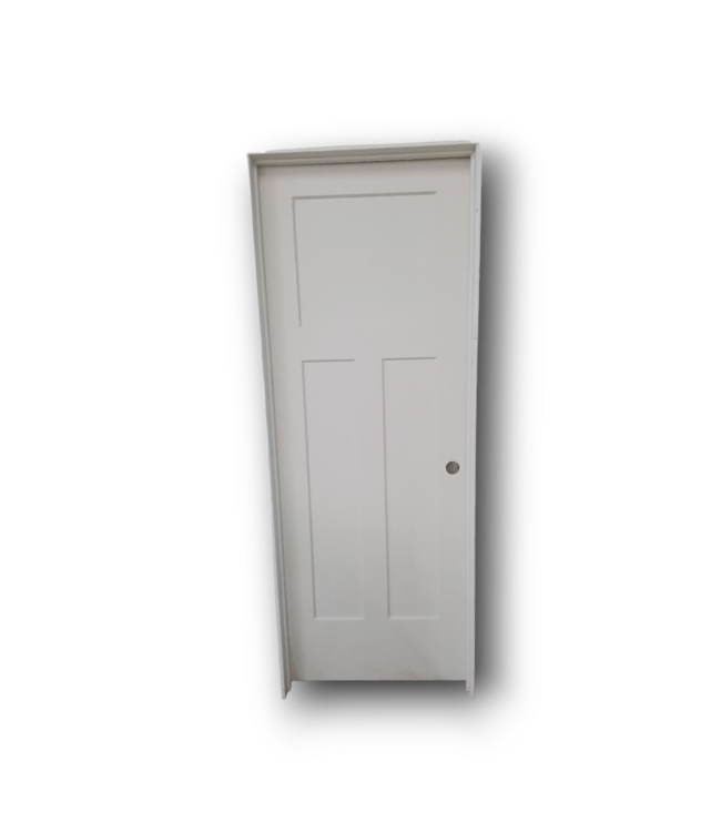 Good condition. Like new. Prehung 3 -Panel Interior Door 30"W x 80"H. Left-hand inswing. Primed, ready-to-paint. Hollow core. Recessed panel design. Single bore. Hollow core. Dimensions: W/O frame: 29.75"W x 80"H. / W;frame: 31.25"W x 81.75"H.