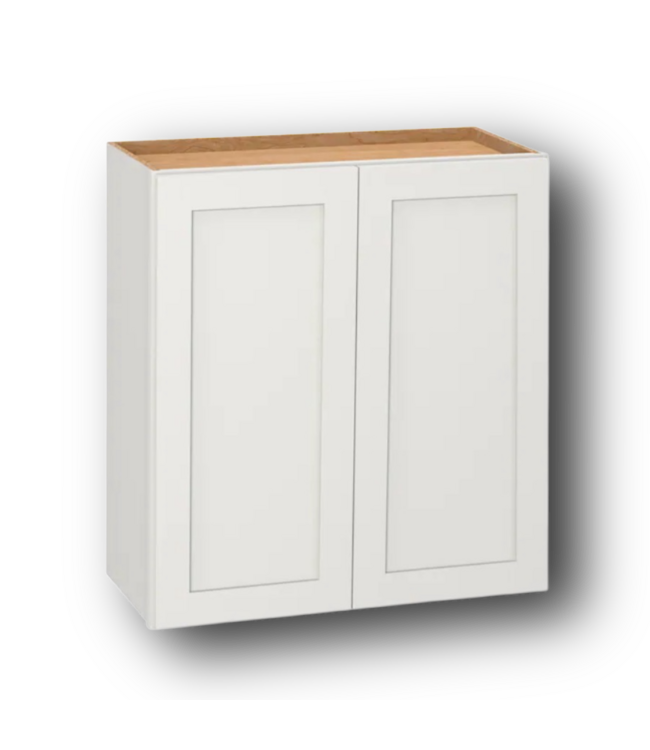 Good condition. Diamond Now 27" White Shaker Wall Cabinet. Two adjustable shelves. 6-way adjustable, standard close, concealed hinges. Scuff and stain resistant. Easy-to-clean. Plywood construction. Finished sides. Dimensions: 27"W x 12"D x 30"H.