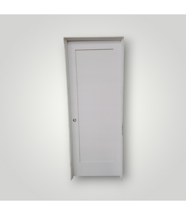 Good condition. Like new. Masonite 30-in x 80-in 1-panel Prehung Interior Door. Right-hand inswing. Smooth. Primed, ready-to-paint. MDF. Flat Jamb. Solid Core. Single bore. Satin nickel hinges. Dimensions: W/O frame: 30" x 80" / W/frame: 31.5"W x 81.75"H.