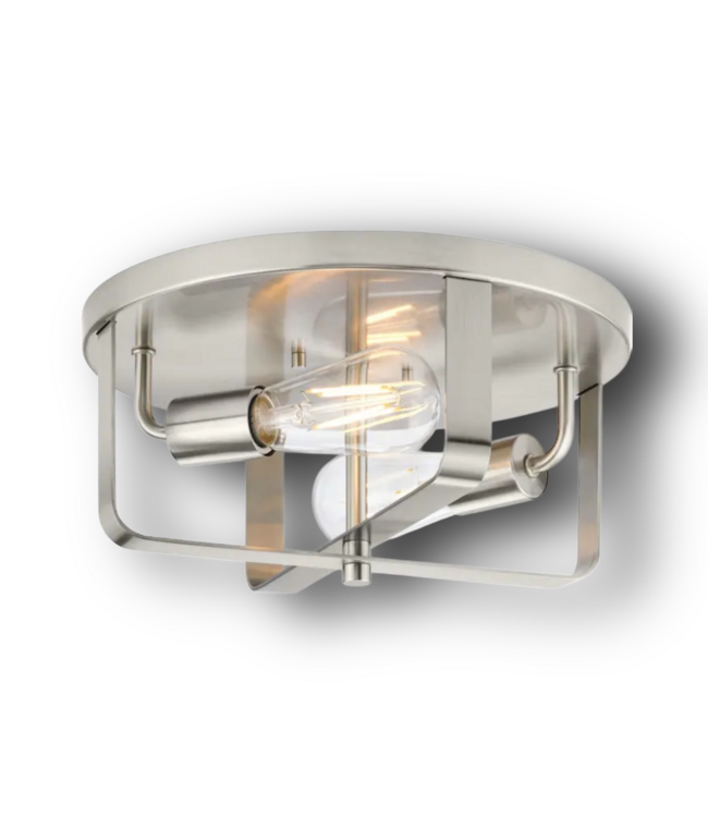 Good condition in box. Like new. Progress Lighting McColl 2 -Light 12-in Brushed Nickel Flush Mount Light. Dimmable. Hardwired. Damp rated. Uses 2 medium base bulbs that are sold separately. Dimensions: 12W x 12"L x 5.75"H.