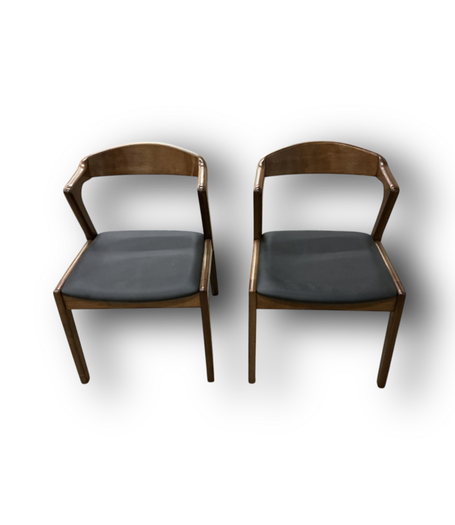 Pre-owned in good condition. 2-chairs. Walnut wood color. Black faux leather seat cushion. Mid-century mixed with modern style. Dimensions: 19.5"W x 17.5"D x 29"H. Seat height: 17.5".