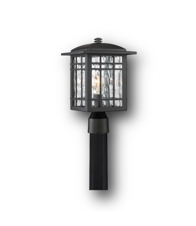Good condition in box. Like new. Quoizel Canyon 14.73-in Matte Black Traditional Outdoor Post Light. Uses (1) Medium base (E-26) bulb (Not included). Dimensions: 9.13-In W x 14.73-in H x 9.13-in D.