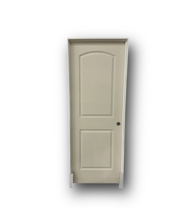Good condition. Like new. Prehung 2 -Panel Interior Door 30" x 80". Left-hand inswing. Primed, ready-to-paint. Single bore. Hollow core. Brushed nickel hinges. Dimensions: W/O frame: 29.875"W x 80"H / W/frame: 31.25"W x 81.75"H.
