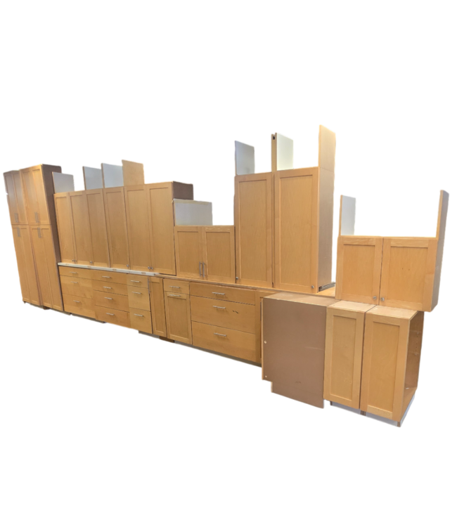 Pre-owned in good condition. Fully functional cabinet set featuring two pantries and a Lazy Susan, finished in natural oak. Some pieces have ledges for upper storage. To view specs & dimensions *see photos*.