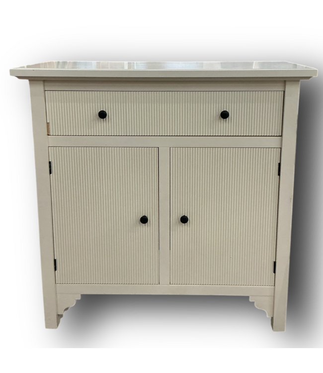 Used in fair condition. Off white color. 1-pullout drawer. 1-adjustable shelf. 2-doors. Black hardware. Dimensions: 38"W x 17.5"D x 37.5"H. Does have signs of use, the bottom and shelf need to be assembled *see photos*.