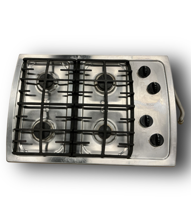 Used in good condition. Whirlpool 30" Gas Cooktop With 2 Power Burners. Versatile heating power for quick boiling and easy simmering. Full width cast iron grates. Stainless steel cooktop. 4 Sealed burners. 120V. Knob auto re-ignition. Built in.