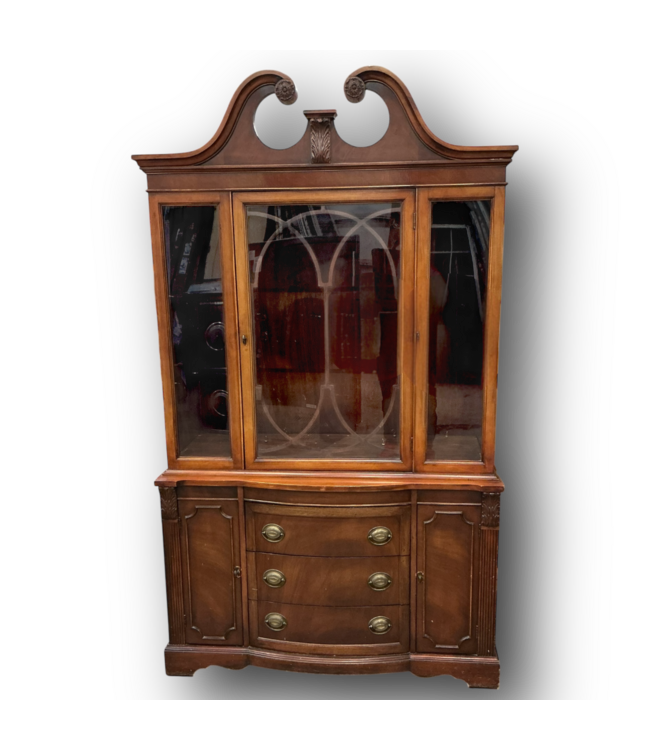 Pre-owned in good condition. Bow front. Store and display dishes, glassware, and collectibles. Tall cabinet with 3-glass panels. 1-glass panel door with decorative wood between glass. Mahogany color. Dimensions: 46"W x 16"D x 79.625"H.