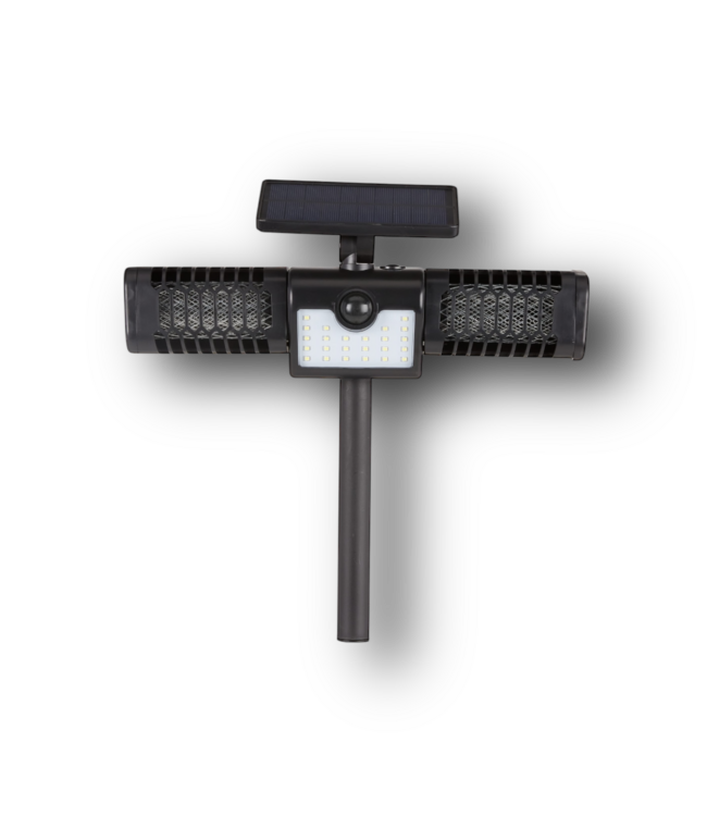 Good condition in box. Like new. Bell + Howell Solar Monster 2-in-1 Flood Light Bug Zapper. Solar powered. Motion activated. Outdoor LED illumination. Integrated bug zapper grid. Weather resistant housing. Wall or stake mount. 8‑in H x 8‑in W x 8‑in D.