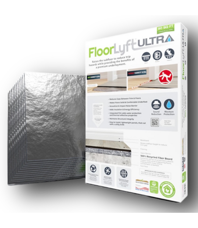 Good condition in box. FloorLyft Ultra Rigid Fiberboard Floor Underlayment. Premium felt. Moisture resistant. Corrects floor gap, soundproof, vapor barrier. IIC rating 71-75. 15 pieces per box. Dimensions: 2'W x 3'L x 6mm thick = 90 sq. ft. Read more.