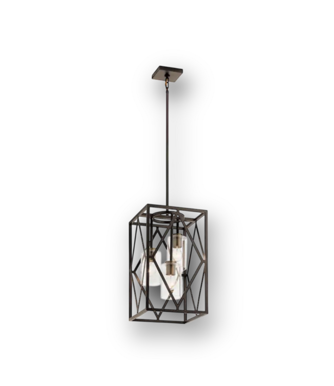 Good condition in box. Kichler Solander 12-in Olde Bronze Pendant. This three-light fixture features a geometric frame with clear glass shades. It measures 12 inches wide by 20 inches high and includes a 36-inch chain. Uses 60-watt medium base bulbs.