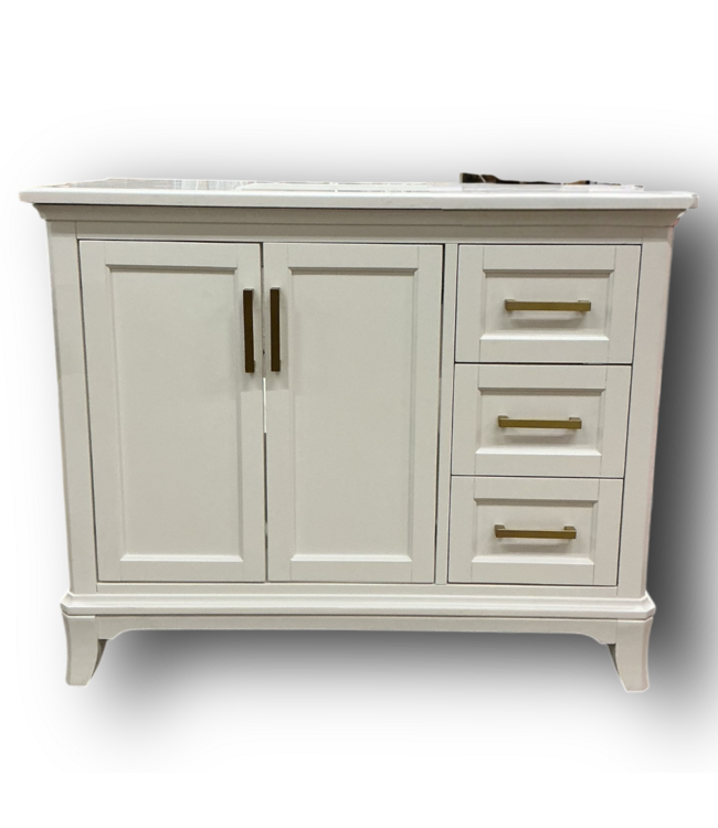 Good condition. Fully assembled. Marble top. Center sink. Recessed panels. 3-pullout drawers. 1-door. Open back. Pre-drilled holes for 8-in centerset. Backsplash included. Gold hardware included. Dimensions: 43"W x 22"D x 35"H.
