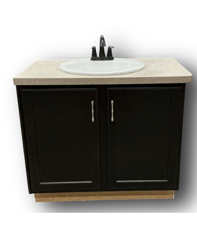 Pre-owned in good condition. 2-doors. Espresso finish color. Peach formica top. Round sink bowl with oil-rubbed bronze 2-handle faucet included. Toe kick, the espresso cover needs to be re-attached. Does have cutout holes. Read more.