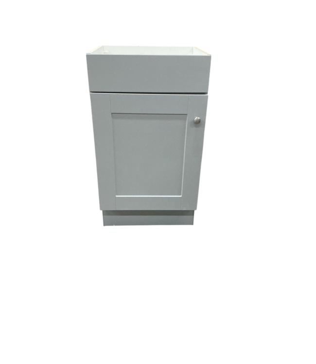 Good condition. Like new. Project Source Dove Gray 18" Vanity Base. One door. Brushed nickel door hardware. Matching toe kick. Recessed panel door style. Open back for plumbing fixtures. Dimensions: 18"W x 16.25"D x 32"H.