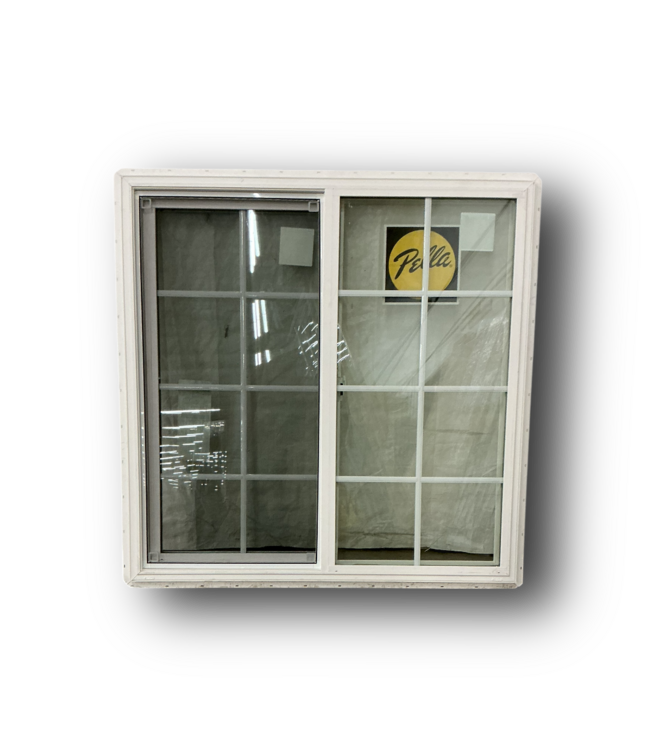 Good condition. Like new. Pella 250 Series White Vinyl Horizontal Sliding Window 47.5" x 47.5". 16 grids. Annealed glass. Argon gas fill. Half screen included. Dimensions: 47.5-in W x 47.5-in H.