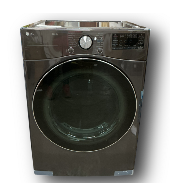 In good condition, unboxed in store. LG TruSteam Stackable Electric Dryer Black Steel. 4-way venting with steam cycle. Reversible door. Digital control. 12 cycles. Air dry/air fluff. Dimensions: 27"W x 30.13"D with door closed x 39"H.