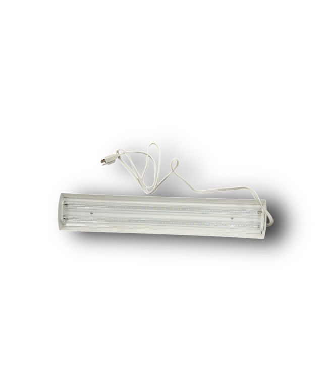 Good condition. GE 24-in 250W Balanced LED Grow Light. High-output 24-in grow light with balanced spectrum for seeds and greens. Energy-efficient LED. White housing. Perfect for gardens. Priced lower as mounting chains are not included.