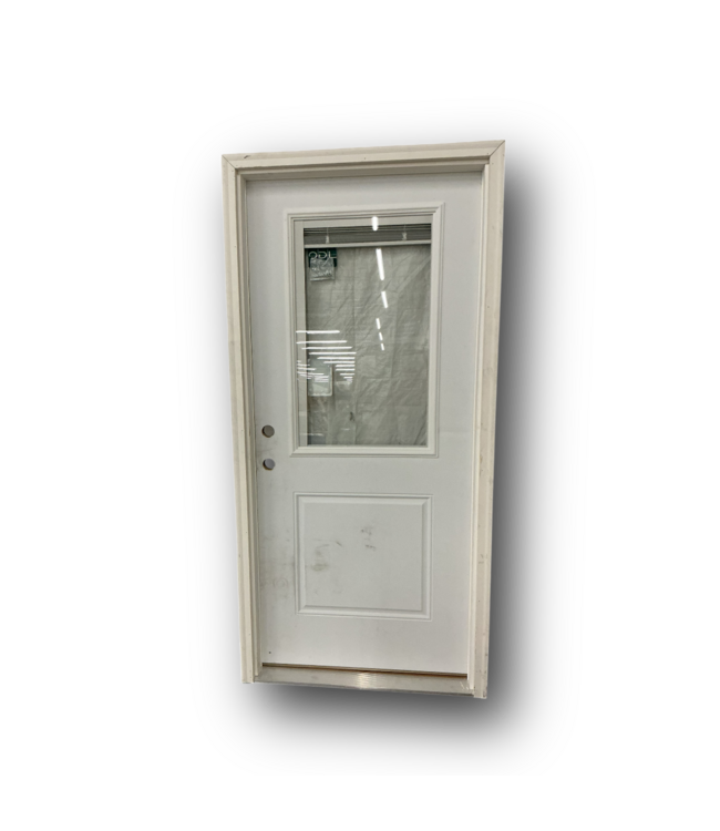 Good condition. Like new. Reliabilt 36-in Steel Door with Blinds 36 x 80 steel prehung door. Right-hand inswing. 4-9/16-in jamb. Internal blinds between glass. Primed white and energy efficient. Rough opening: 38-in x 82.25-in.