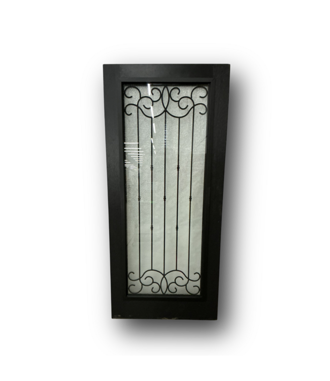 Features full-lite Borrassa decorative glass with wrought iron. Architecturally correct design. Reversible for left or right swing. Priced elsewhere at $1,500. Ready for stain.