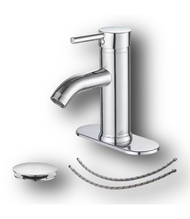 Good condition in box. BWE Stellar Shimmer Polished Chrome Bathroom Faucet. Single hole. 1 handle. Low arc. Drain and deck plate, supply lines included. Corrosion, scratch resistant. Dimensions: 6.8"H.