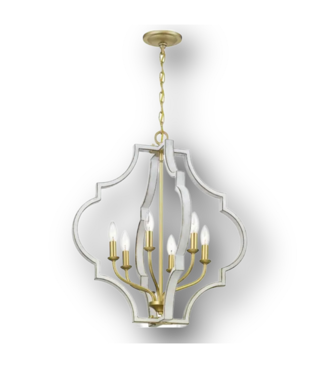Good condition in box. Progress lighting Teigen collection. Gold & antique white colors with faux candlesticks. Geometric shape. Dimmable. Hardwired. Mounting hardware included. Dimensions: 24"W x 24"D x 25.5"H. Adjustable hanging height: 28.5" to 99.5".