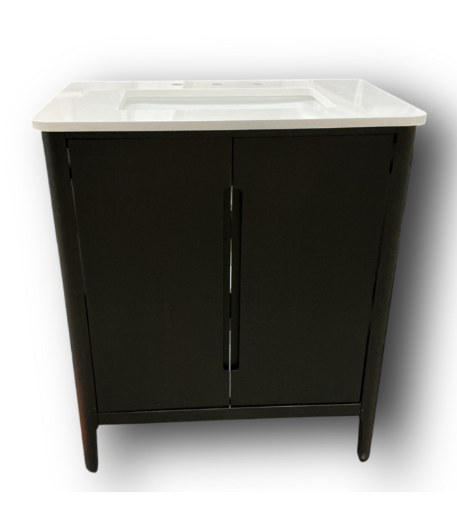 In good condition, unboxed in store, fully assembled. Origin 21 Jenkins 30" Black Bathroom Vanity With Top. Undermount single sink. Engineered stone. Flat edge. 2 soft close, 1 shelf, backsplash included Dimensions: 30"W x 20"D x 34.5"H. Read more.